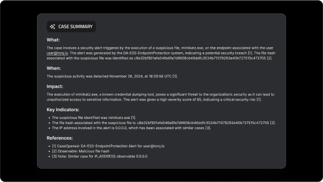 • Analyze comprehensive case data with AI including any associated events, observables, case notes or attachments, and any similar historical cases.