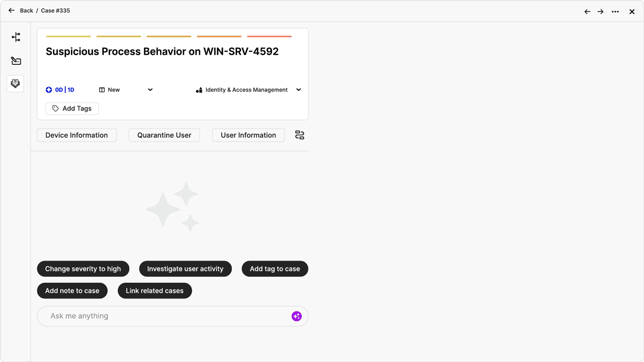 - AI-generated case summaries: Faster access to real-time and historical case observables, attachments, associated indicators of compromise (IOCs), or current case status enables streamlined decision-making by eliminating irrelevant noise.