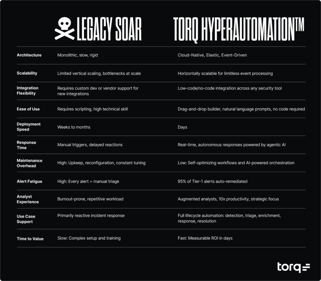 Legacy SOAR platforms promised security automation. Torq HyperSOC delivers it at a scale, speed, and intelligence legacy systems simply can’t match.
