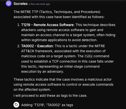 Just as human analysts rely on insights from the runbook, Socrates can assist in automating investigation or even incident response tasks. This includes executing tasks such as alert triage, data enrichment, containment, and remediation actions, which speeds up response times and reduces the manual effort required from human analysts.