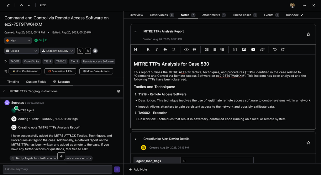 - Annotates the case: It logs its reasoning, links evidence, and updates the timeline with MITRE-aligned insights.