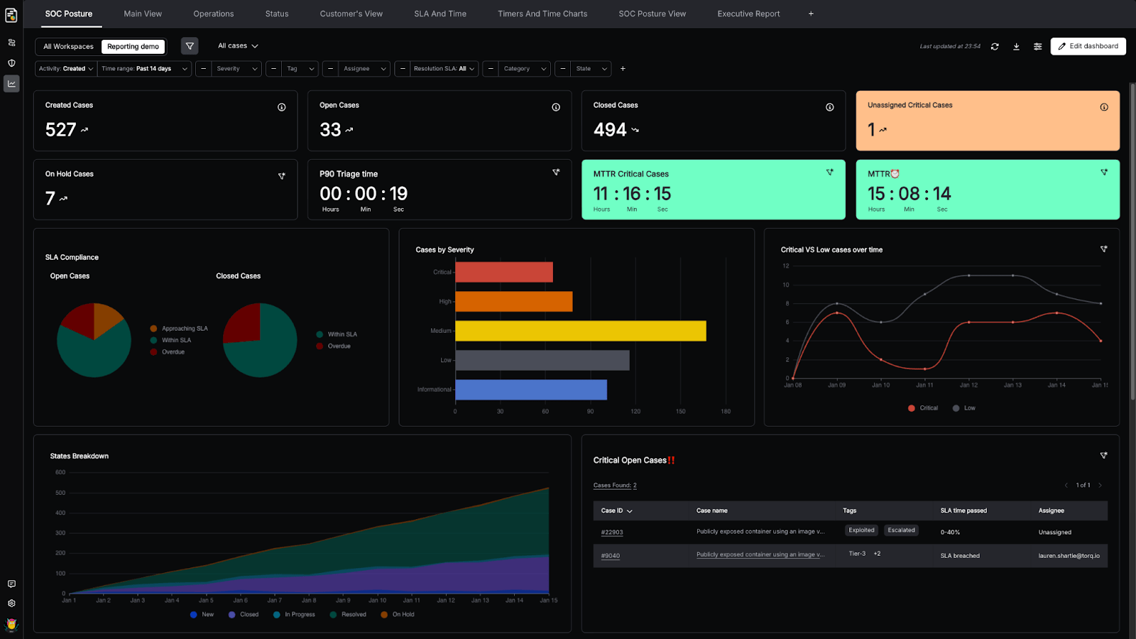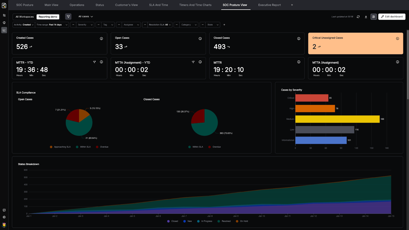 Cases Dashboards are built for customization without ceremony. You can take a question you care about (SLA risk, MTTR/MTTI/MTTT, workload balance, a noisy source, a spike in criticals), turn it into a visual view across cases, and adjust it as the SOC changes.