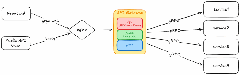 Our application utilizes an API Gateway as the sole entry point for all external traffic. This gateway centralizes API access and comprises a collection of gRPC services. The continuous integration (CI) process for the API Gateway repository includes the automatic generation of TypeScript client libraries.