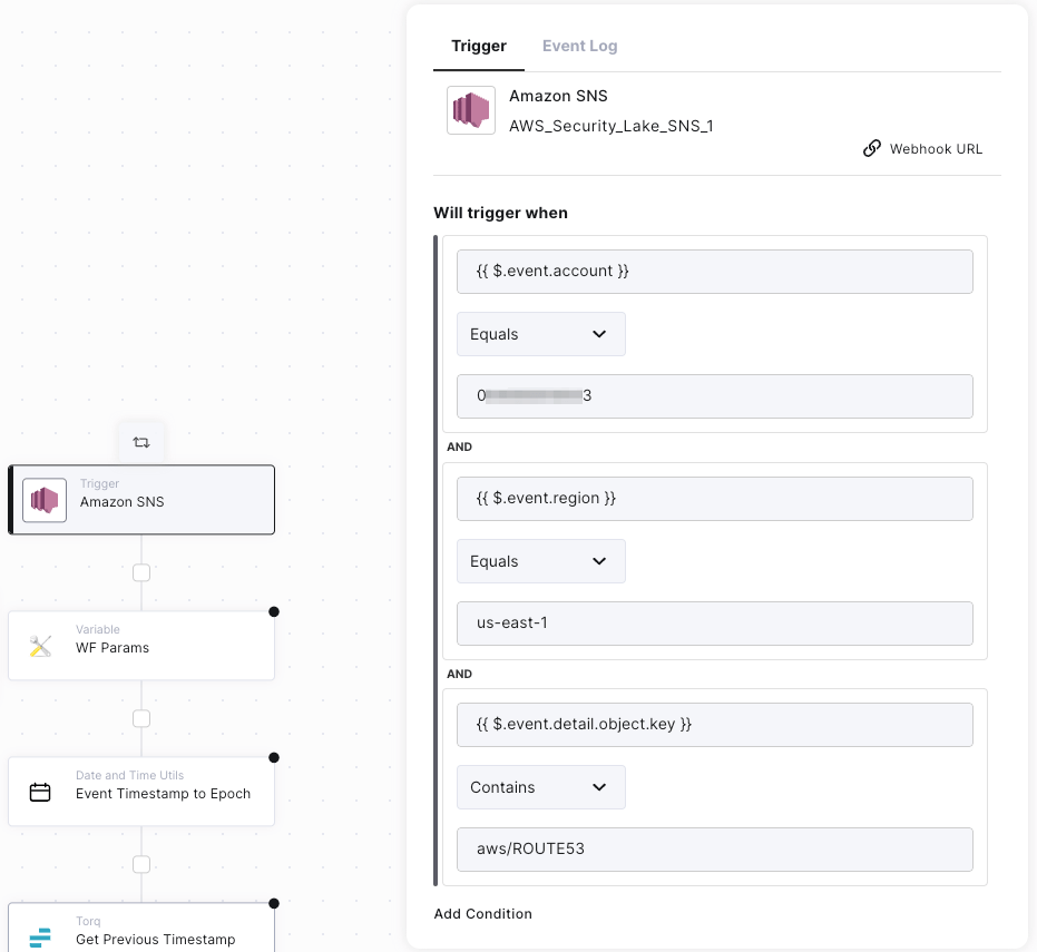 Depending on the settings you defined in step #5 above (Log and event sources) it might be necessary to define trigger conditions in your Torq workflows triggered from Amazon Security Lake events. Here’s an example of a trigger condition meant to restrict a workflow to be triggered by Route53 events in Amazon Security Lake from a region us-east-1 only: