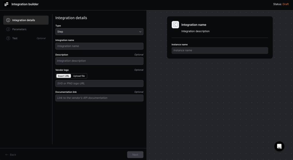 If the integration you need isn’t in Torq’s library, you can create it yourself as a custom integration. In the Integrations section of the Build menu, select Create New Integration. Provide a name, description, and any required connection details such as API endpoints, authentication credentials, or tokens. After saving, your new integration becomes available for use in workflows just like any built-in connector.