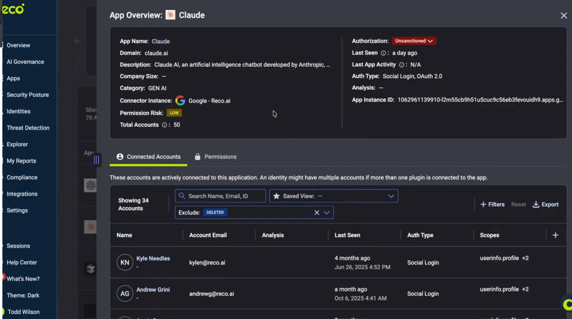 In the demo, Reco identifies a user connecting Claude.ai to their corporate Google Drive — a risky action depending on the user’s role, data access, and organizational policy.