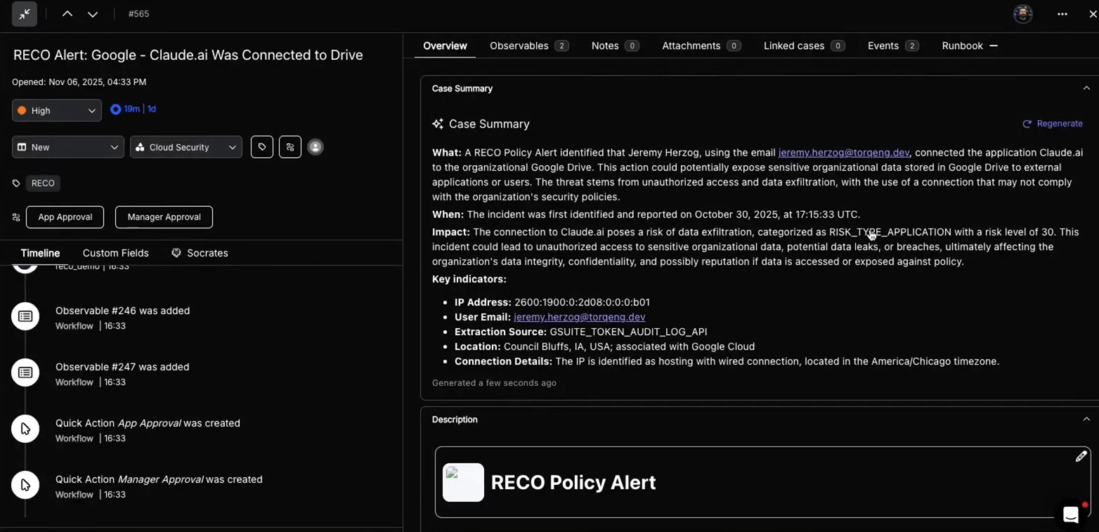 When Reco detects a high-risk SaaS access event — a suspicious AI app connection, abnormal permission grant, or data exposure — it sends that signal straight into Torq HyperSOC™. From there, agentic AI takes over.