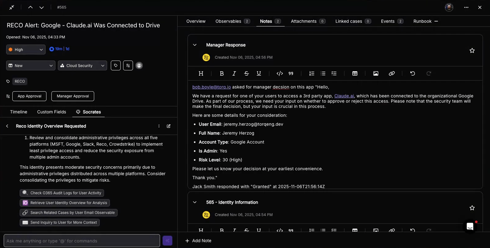 If the case requires deeper investigation, Socrates, Torq’s AI SOC Analyst, steps in and: