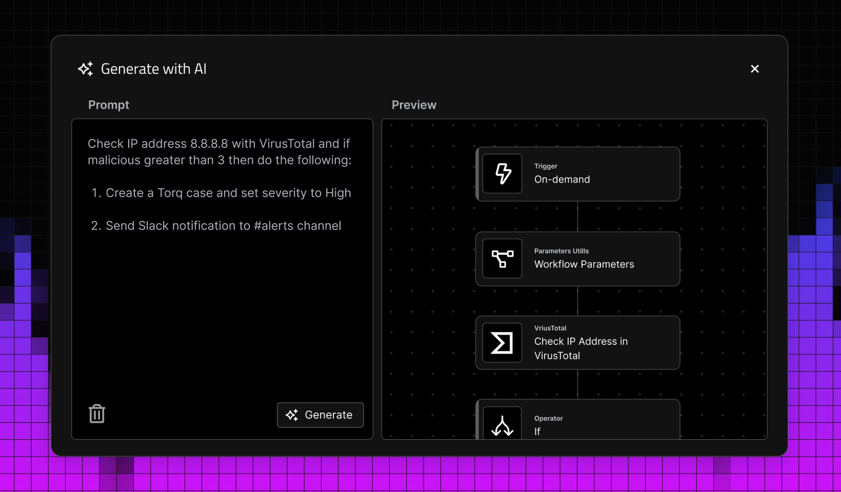 Describe a workflow, use case, or outcome using natural language. Torq Hyperautomation then creates and validates production-ready workflows that secure your enterprise faster than ever.