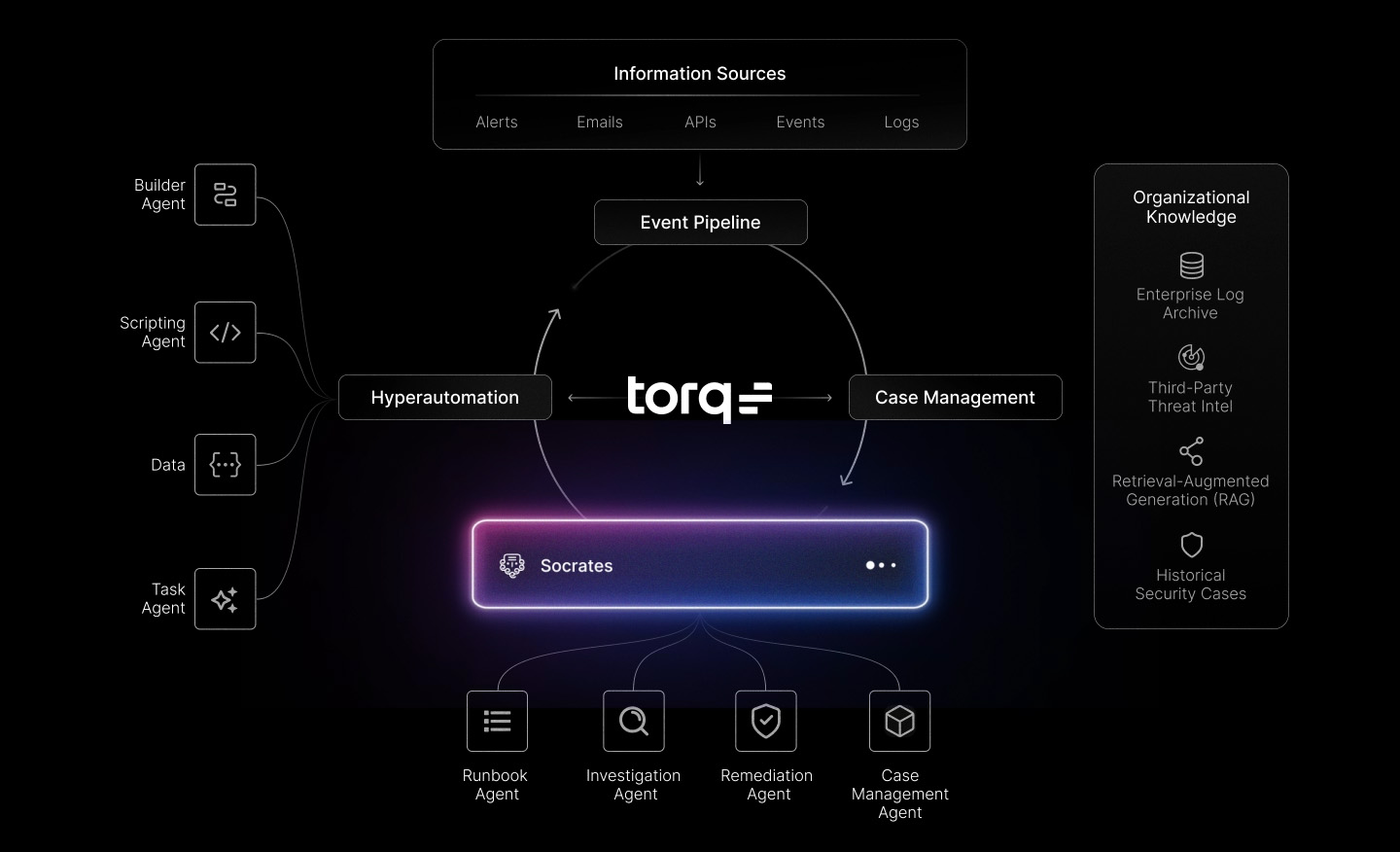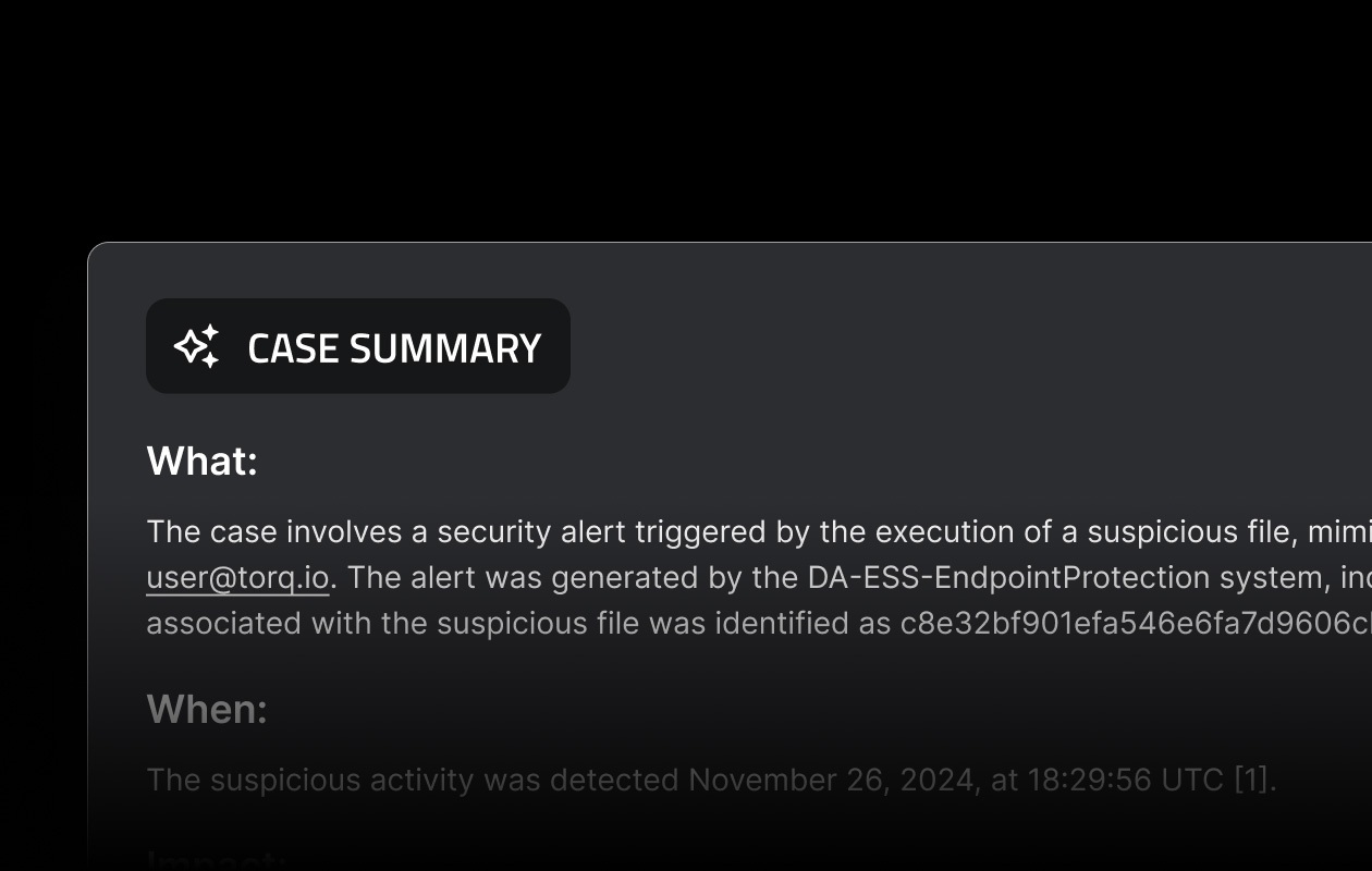 Embed adaptive autonomy throughout the entire case management lifecycle by combining the power of Torq’s Multi-Agent System (MAS) and Hyperautomation engine to triage, investigate, and monitor SOC responses at machine speed and enterprise scale.