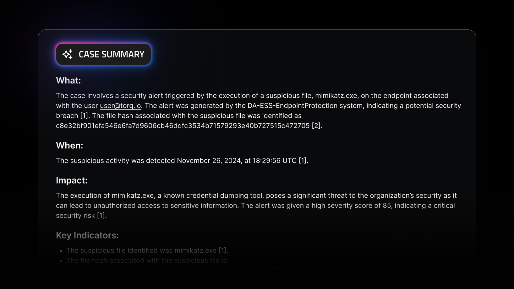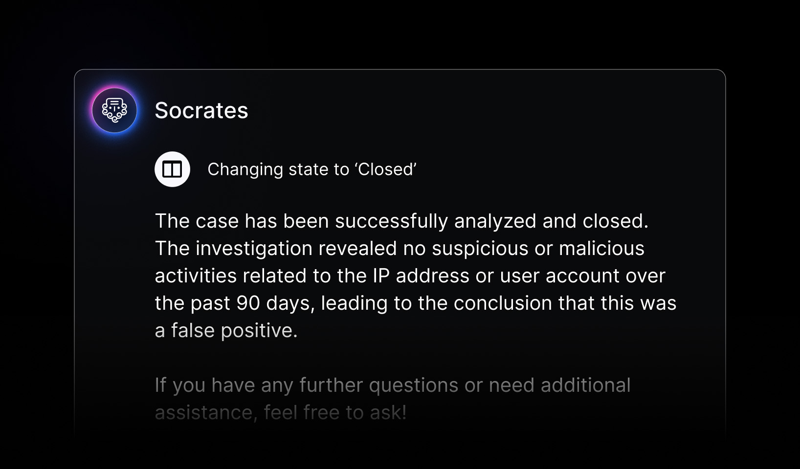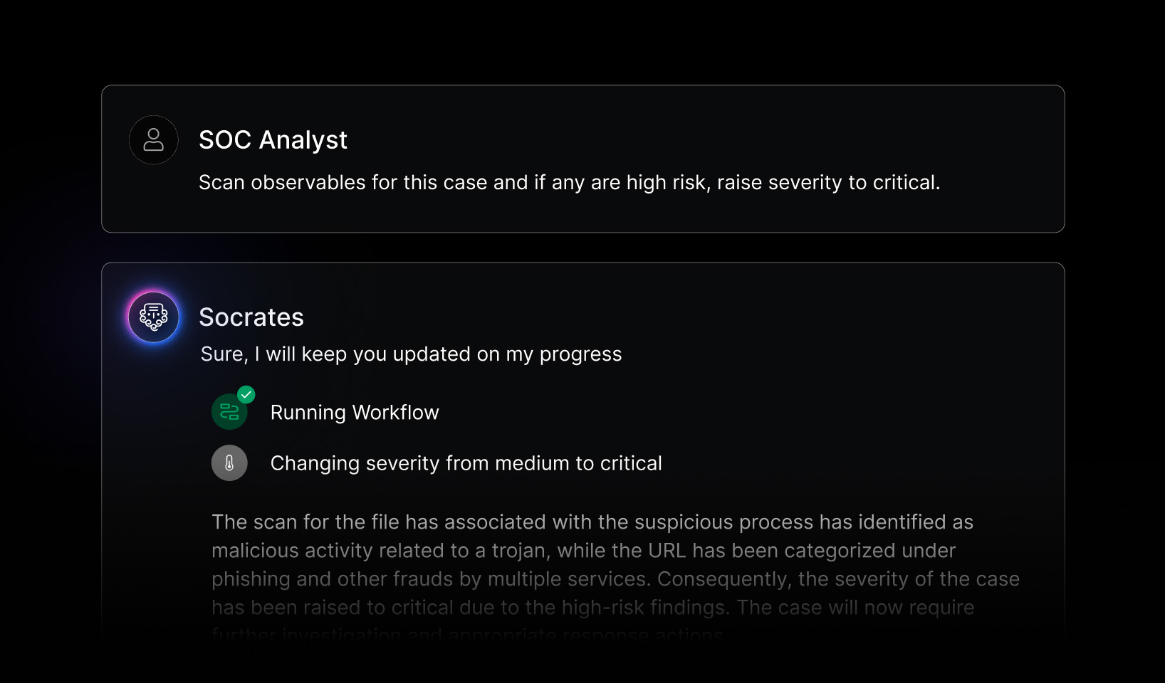 Socrates handles Tier-1 and Tier-2 tickets as a 24×7 on-call teammate, so analysts don’t waste time on low-value triage and remediation. When escalation is needed, it passes full context so analysts never start from scratch.