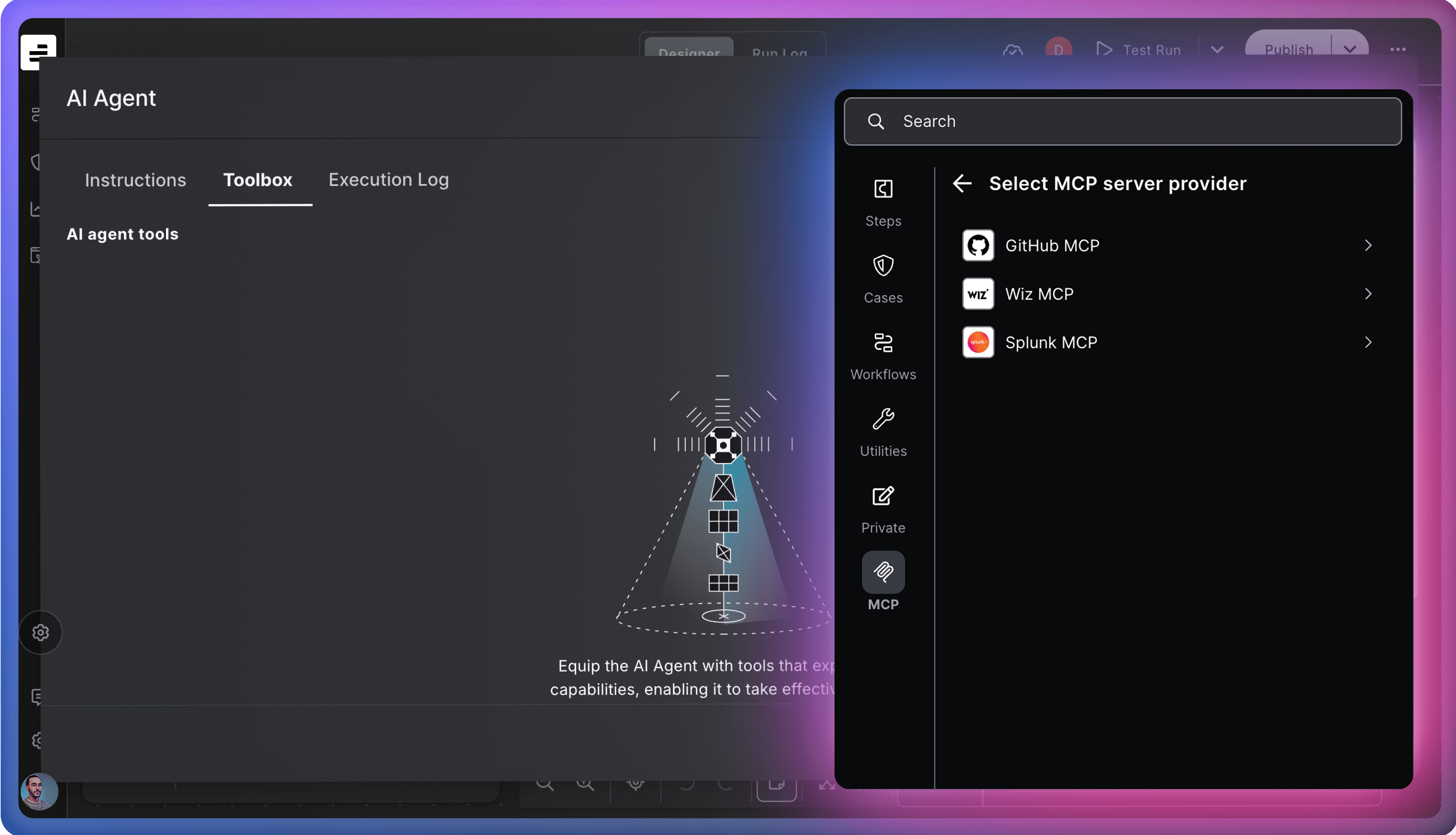 Add MCP tools to Torq AI Agents to enable seamless discovery and invocation of vendor-defined capabilities, no manual API integration required. By acting as MCP clients, agents can reason over and use tools exposed by supported MCP servers directly in workflows, simplifying integrations with modern security platforms.