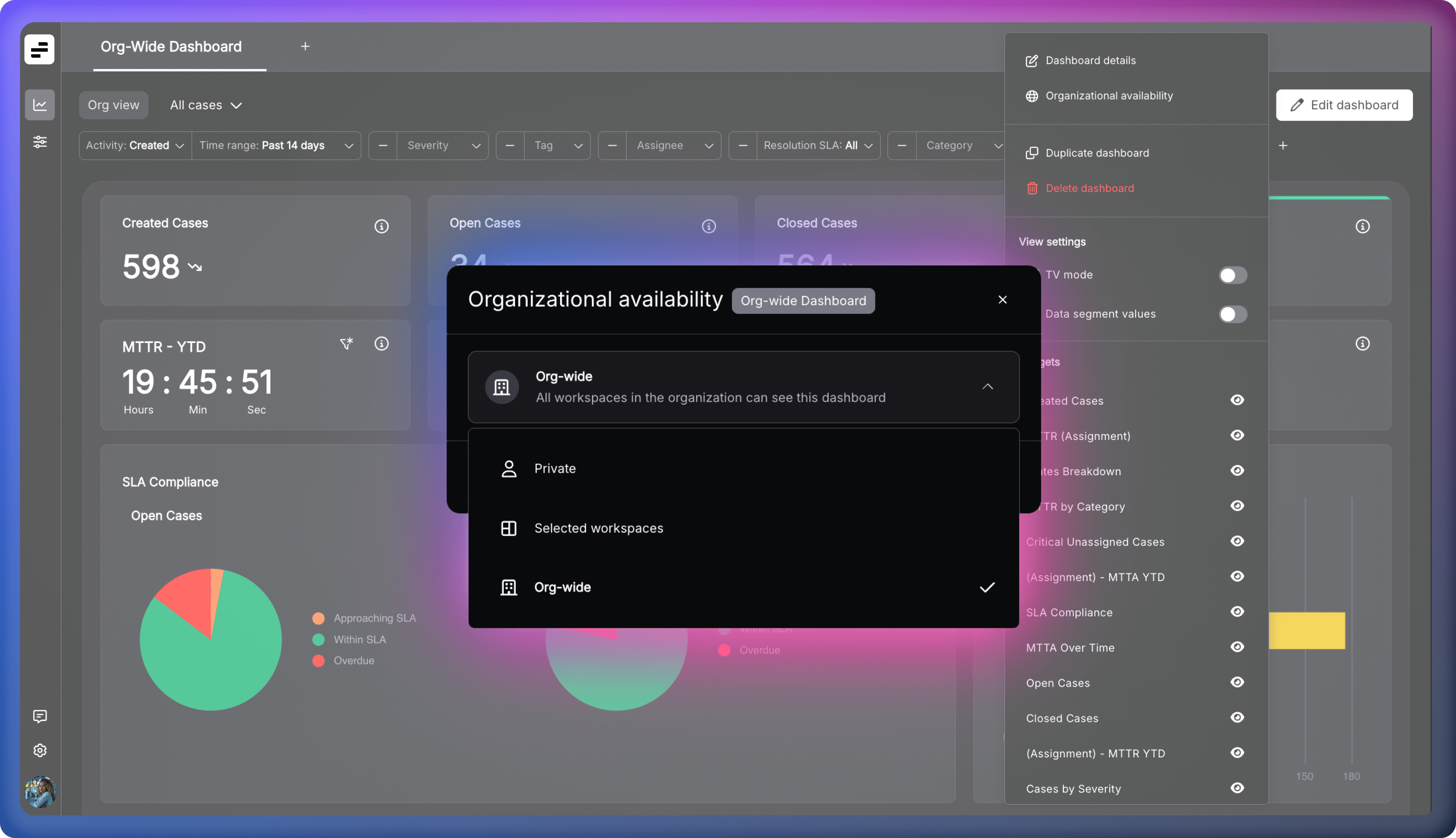 You can now create and manage dashboards in the Organization Management space to make them available across all or selected workspaces. This enables you to build dashboards once and maintain them in one place without needing to recreate them in each workspace.