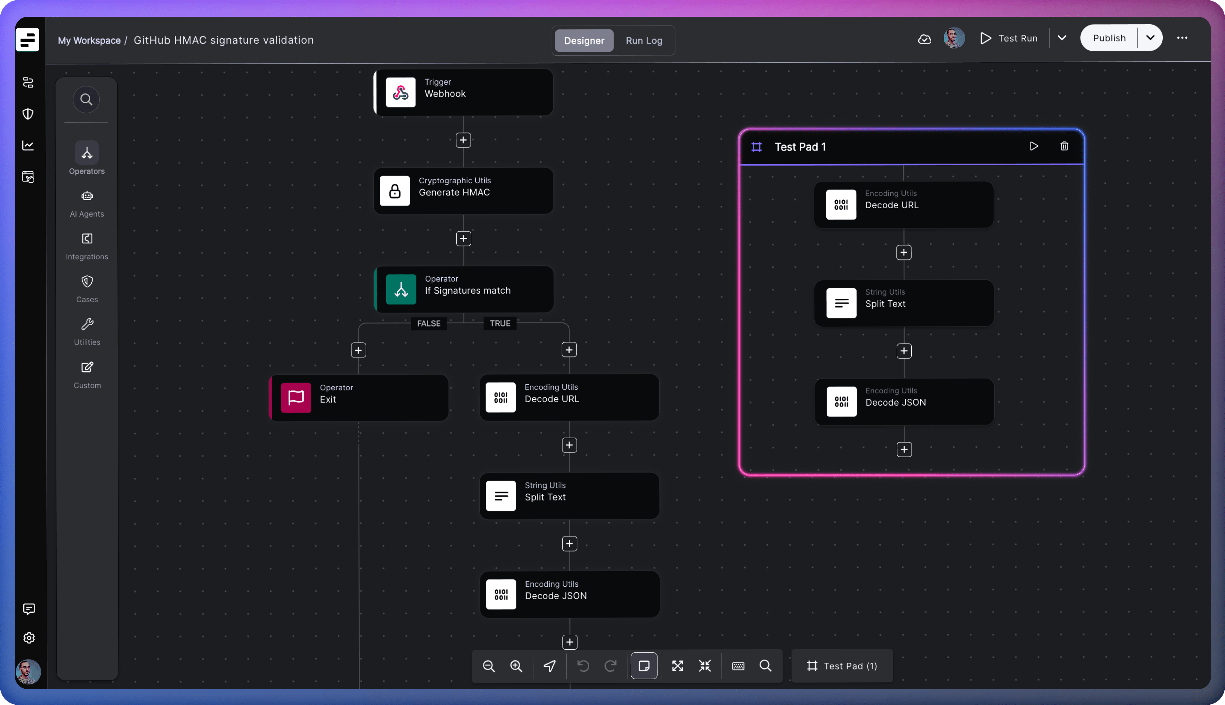 You can now add test pads to your workflow canvas to experiment with steps. This allows you to brainstorm, collaborate, and iterate without affecting the main production workflow.