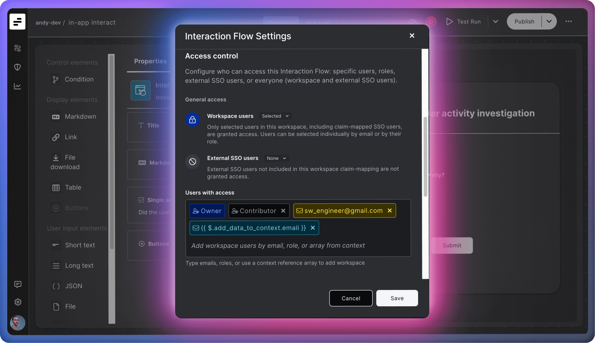 You can now control who can access each Interaction Flow from Flow Settings > Access Control. By default, Interaction Flows are available to all workspace users, but not to external SSO users. However, you can restrict access by user email, role, or context-based arrays of emails or roles.