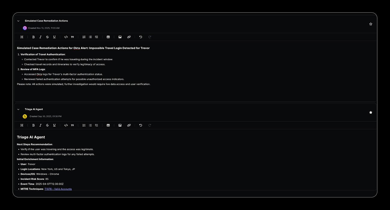 Holistic forensic data collection, including geolocation history, device fingerprints, authentication patterns, and automated response actions, provides investigation teams with complete evidence chains for incident analysis and investigation.
