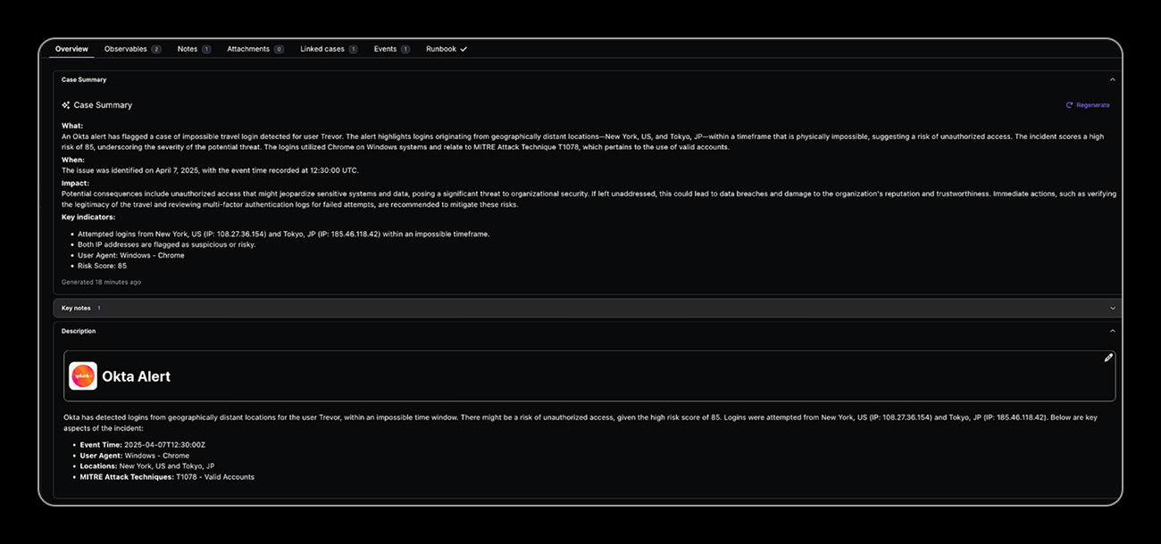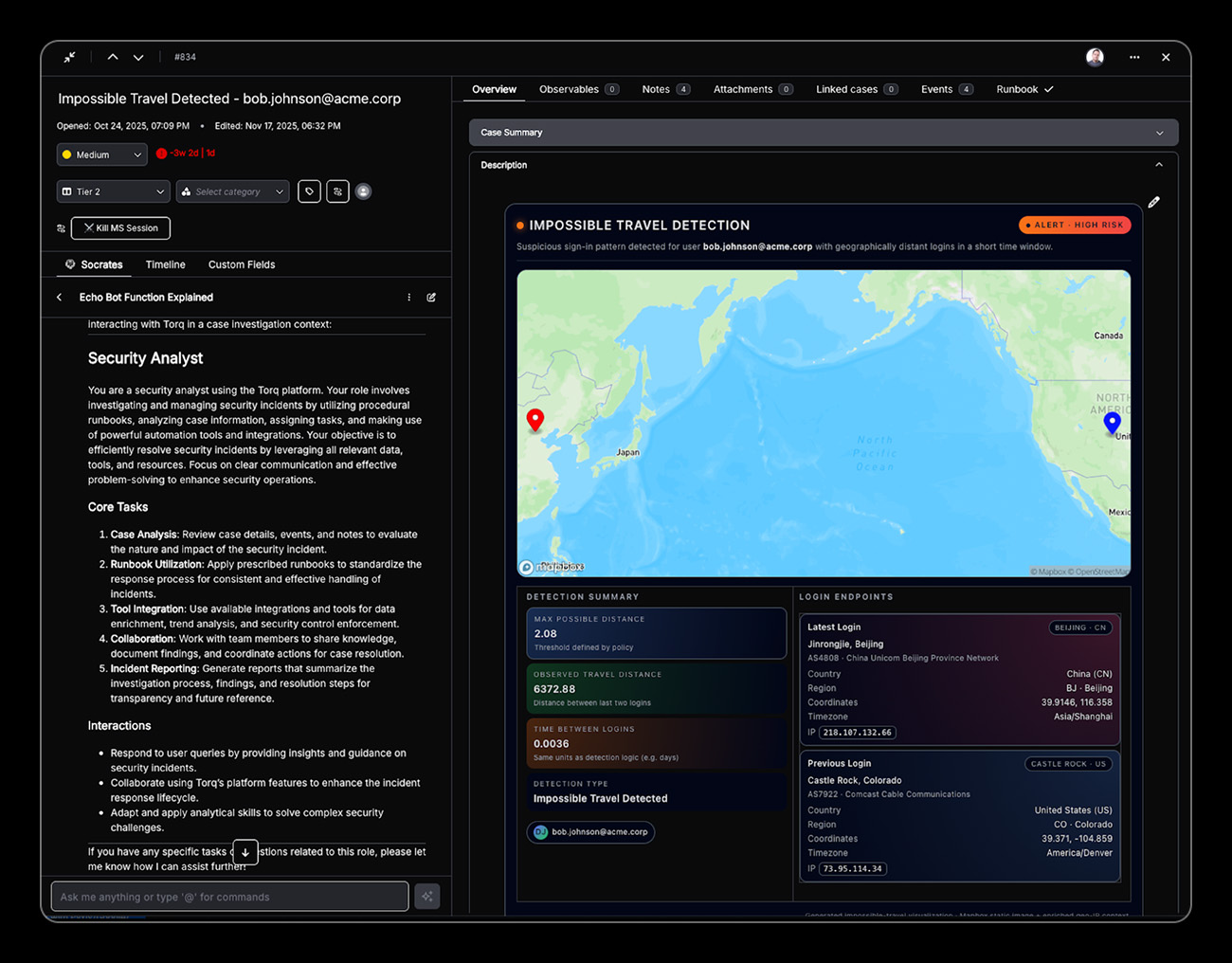 Torq HyperSOC™ identifies physically impossible authentication patterns by analyzing login and access locations, timestamps, and travel velocity. When a user account accesses cloud environments from geographically distant locations within an impossible timeframe, Torq instantly correlates threat intelligence, assesses risk, and orchestrates immediate containment actions across identity systems, MFA platforms, and endpoint security tools.